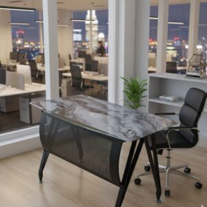 تصميم أنيق، انسيابي، يجمع بين صفاء الزجاج وصلابة المعدن، ليمنحك مكتبًا يليق بمكانتك ، ويعكس ذوقك الرفيع في أدق التفاصيل.