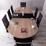 - الشكل والحجم: الطاولة بيضاوية كبيرة، مما يتيح استيعاب عدد كبير من الأشخاص (قد يصل إلى 8-10 أشخاص حسب الحجم الفعلي) ويسمح بتواصل بصري جيد بين جميع المشاركين. النهايات المستديرة تضفي عليها لمسة ناعمة وأقل حدة من الطاولات المربعة أو المستطيلة.