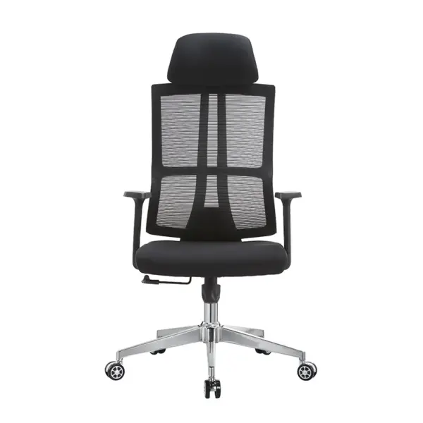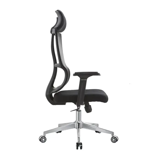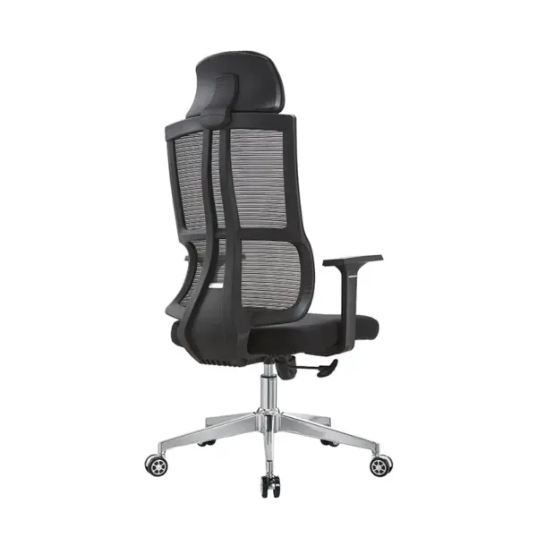 كرسي مكتب بتصميم مريح وعصري، يغلب عليه اللون الأسود مع لمسات معدنية فضية في القاعدة، مما يعكس مظهرًا احترافيًا وأنيقًا ومناسبًا لبيئات العمل المتنوعة والمكاتب المنزلية. يبدو الكرسي مصممًا بعناية لتوفير دعم ممتاز وراحة فائقة للمستخدمين خلال ساعات الجلوس الطويلة.