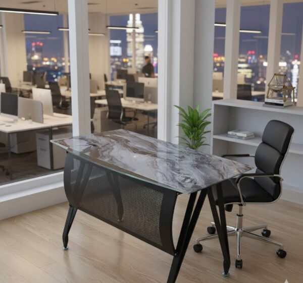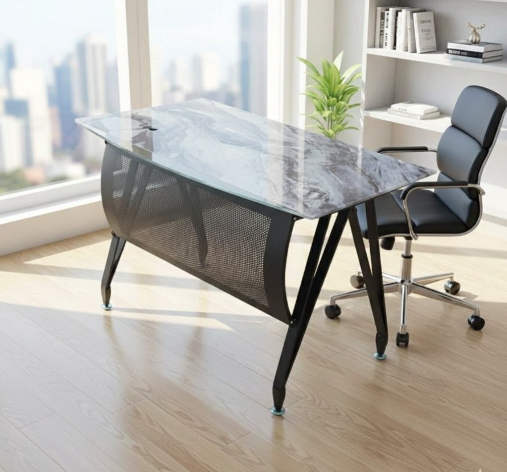 تصميم أنيق، انسيابي، يجمع بين صفاء الزجاج وصلابة المعدن، ليمنحك مكتبًا يليق بمكانتك ، ويعكس ذوقك الرفيع في أدق التفاصيل.