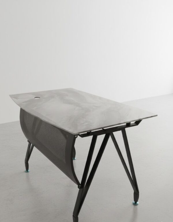 أما القاعدة، فهي مصنوعة من شاسيه حديد مصمم هندسيًا لتحمل الوزن بثبات مثالي، هذا الشاسيه لا يكتفي بتوفير الدعم فحسب، بل يأتي بتشطيب معدني أنيق يضيف لمسة صناعية فخمة تكمل الانطباع العام للمكتب