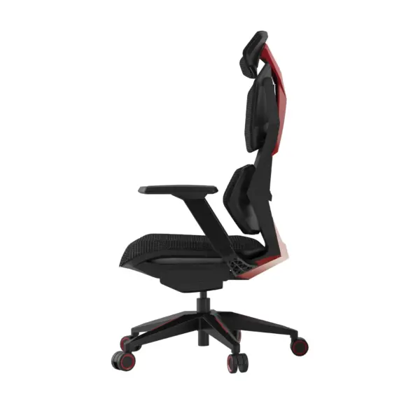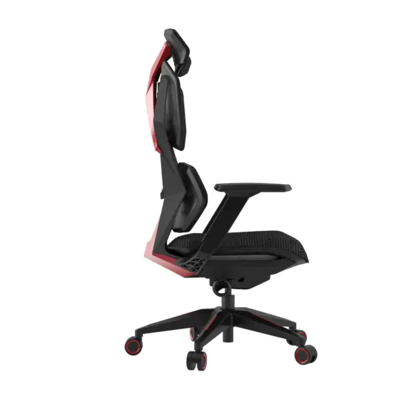 كرسي ألعاب (Gaming Chair) بتصميم عصري وجريء، يجمع بين اللونين الأسود والأحمر، مما يمنحه مظهرًا رياضيًا ومميزًا. يبدو الكرسي مصممًا لتوفير الراحة والدعم اللازمين للجسم خلال فترات الجلوس الطويلة، وهو أمر ضروري للاعبين أو أي شخص يقضي ساعات طويلة أمام المكتب.