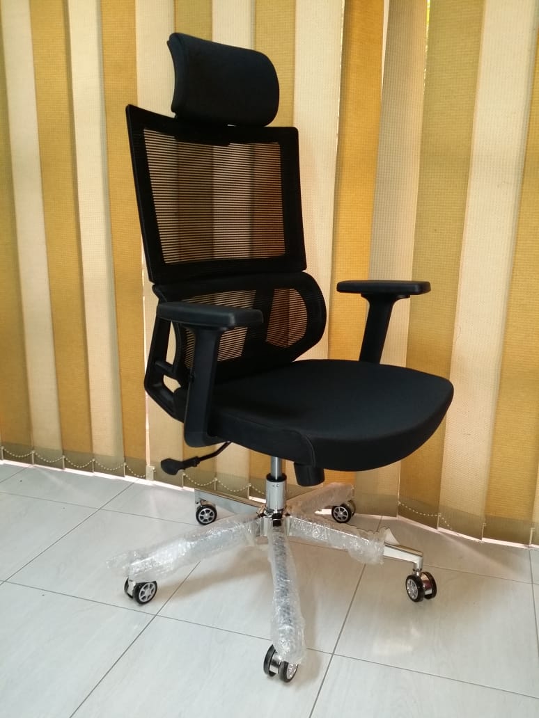 كرسي مكتب بتصميم مريح وعصري، يغلب عليه اللون الأسود مع لمسات معدنية فضية في القاعدة، مما يعكس مظهرًا احترافيًا وأنيقًا ومناسبًا لبيئات العمل المتنوعة والمكاتب المنزلية. يبدو الكرسي مصممًا بعناية لتوفير دعم ممتاز وراحة فائقة للمستخدمين خلال ساعات الجلوس الطويلة.