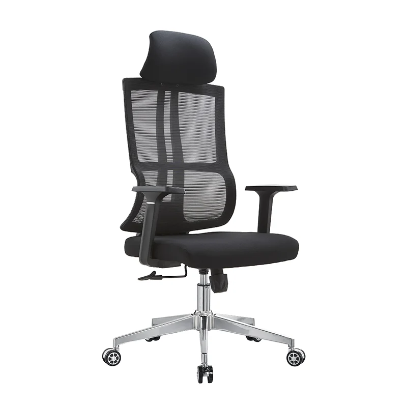 كرسي مكتب بتصميم مريح وعصري، يغلب عليه اللون الأسود مع لمسات معدنية فضية في القاعدة، مما يعكس مظهرًا احترافيًا وأنيقًا ومناسبًا لبيئات العمل المتنوعة والمكاتب المنزلية. يبدو الكرسي مصممًا بعناية لتوفير دعم ممتاز وراحة فائقة للمستخدمين خلال ساعات الجلوس الطويلة.