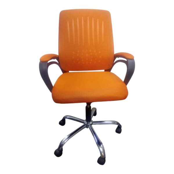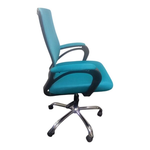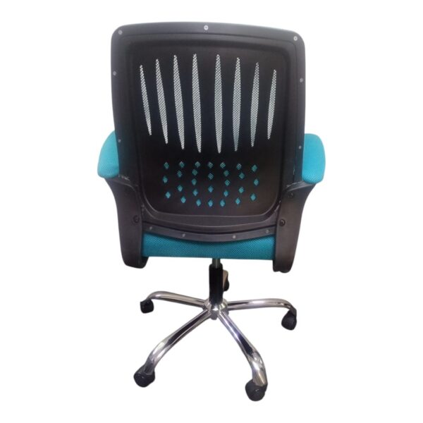 - القاعدة والحركة: يستند الكرسي على قاعدة خمسية (Five-star base) من البلاستيك الصلب، مزودة بعجلات دوارة تتيح حرية الحركة الكاملة والتنقل بسهولة داخل المكتب.
