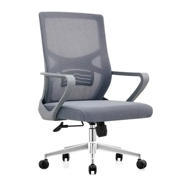 - القاعدة والعجلات: الكرسي مدعوم بقاعدة نجمية بخمسة أذرع، مصنوعة من البلاستيك الأسود المتين، ومجهزة بعجلات مزدوجة. هذه العجلات تتيح حركة سهلة ومرنة على الأرضيات، مما يسهل التنقل حول مساحة العمل.