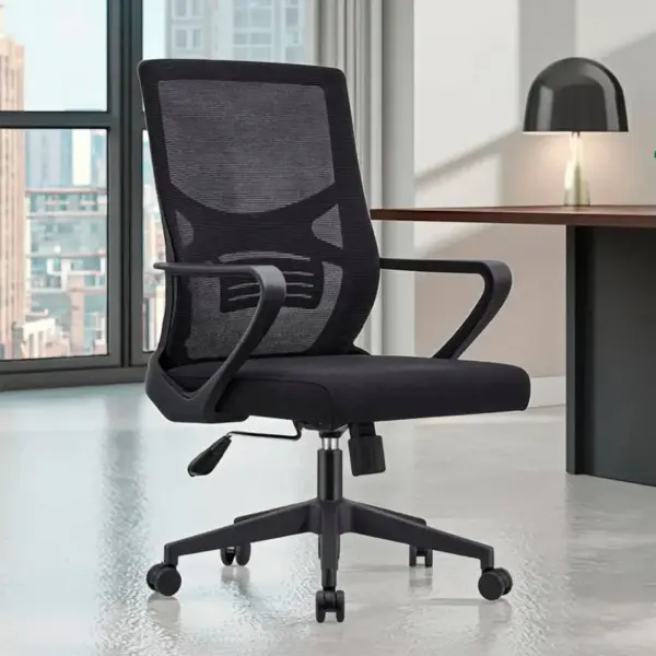 - مسند الظهر: مسند الظهر متوسط الارتفاع، مصنوع بالكامل من مادة شبكية سوداء. هذه المادة توفر تهوية ممتازة للظهر، مما يقلل من التعرق ويزيد من الراحة، خاصة في الأجواء الحارة أو عند الجلوس لفترات متوسطة. التصميم الشبكي يجعله خفيفًا بصريًا.