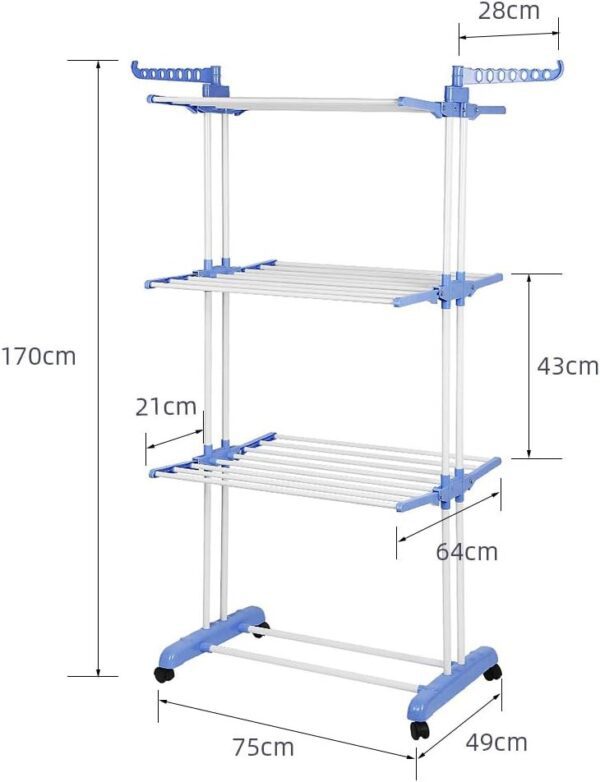 - متين: المجفف القابل للطي مدعوم بأربع زوايا وله سعة تحميل قوية. يمكننا ضمان ثبات وموثوقية الدعامة. الحجم غير المطوي: 72 × 56 × 152 سم، الحمولة 30 كجم