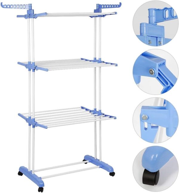 - جودة عالية: مجفف الهواء القابل للطي ثلاثي الطبقات، مزيج من الستانلس ستيل والبلاستيك عالي الجودة يجعل المجفف أداة مساعدة منزلية متينة.